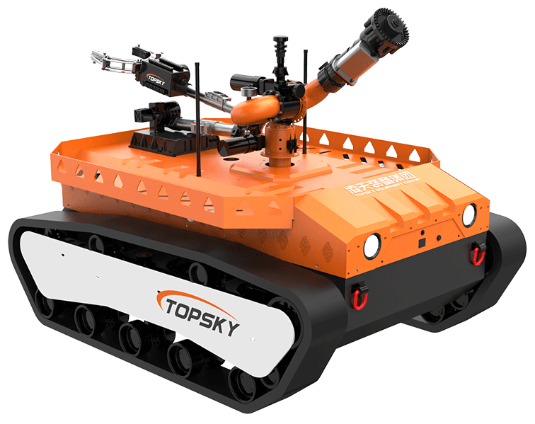 履帶式防爆機器人底盤采用鋰電池電源作為動力源,使用無線遙控的方式遠距離操控,裝載7自由度排爆機械手能實現(xiàn)不同角度旋轉(zhuǎn),機械臂可裝載爆炸物銷毀器,可現(xiàn)場摧毀爆炸物,采用履帶+單擺臂結(jié)構(gòu),能適應(yīng)各種地形快速作戰(zhàn)部署。