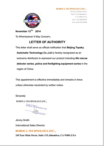 2014年8月26日,北京凌天成為美國(guó)ROBOCA(理諾)公司戰(zhàn)術(shù)警用裝備與救援裝備總代理