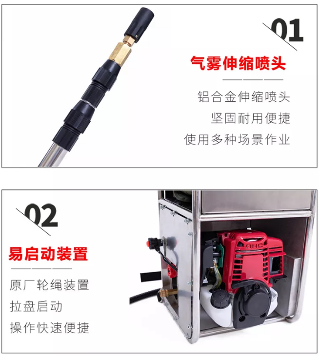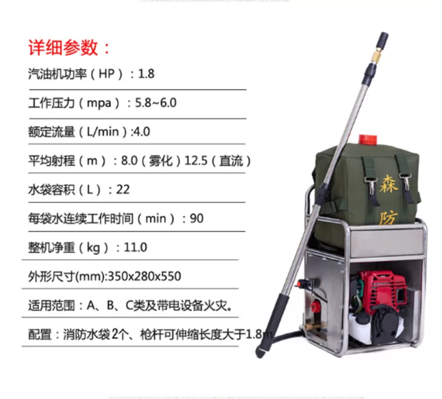 不銹鋼架,便于攜行。泵軸水平布置,減少震動(dòng) 水泵泵體為柱塞液壓隔膜泵。允許砂石顆粒通過(guò),對(duì)水質(zhì)要求低,對(duì)發(fā)動(dòng)機(jī)功率損耗小。 泵組可在橫向、縱向傾斜達(dá)到25°時(shí)正常工作。 水帶直徑40mm,爆破壓力18MPa,表層滌綸長(zhǎng)絲,內(nèi)襯進(jìn)口橡膠,高壓森林接口連接。 水泵配備的動(dòng)力裝置為強(qiáng)制風(fēng)冷四沖程汽油機(jī)。