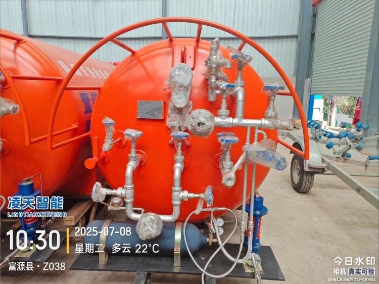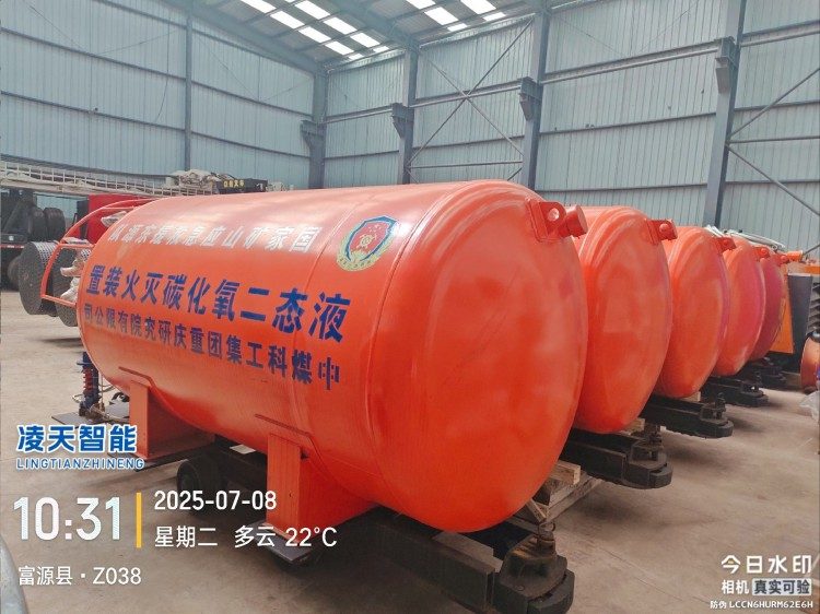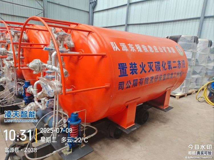 液態(tài)二氧化碳滅火裝置,采用平板車為運載平臺,搭載液態(tài)二氧化碳滅火模塊,采用液態(tài)二氧化碳為滅火劑,運輸至井下火區(qū)近附,經(jīng)自增壓調(diào)控系統(tǒng)實現(xiàn)罐內(nèi)穩(wěn)壓,并通過遠距離輸送管路將液體從罐內(nèi)向密閉火區(qū)噴射,利用其急速膨脹氣化和吸熱效率高的物理特性,可實現(xiàn)惰性降氧,吸熱降溫,吸附阻化等功能,從而可快速進行井下煤層自燃火災(zāi)的預(yù)防與撲滅等。