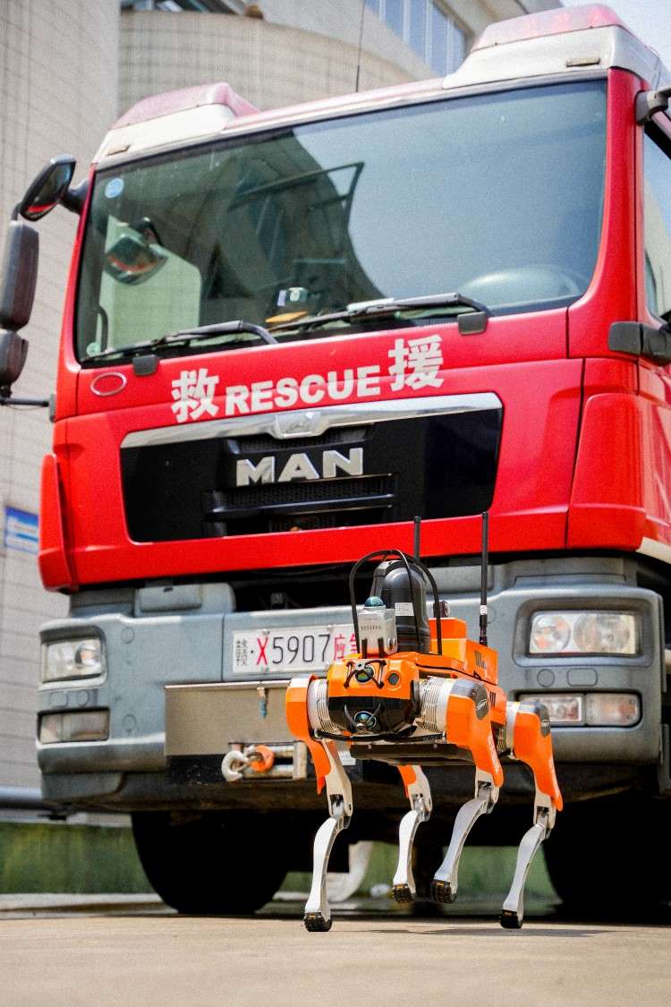 四足機器人搭載4D激光雷達,360°×90°半球超廣角感知能力,超低盲點,可以做出跳躍、伸展、握手、高興、跳人、坐下等手勢; 內(nèi)置長續(xù)航電池,滿足消防偵察救援需求。